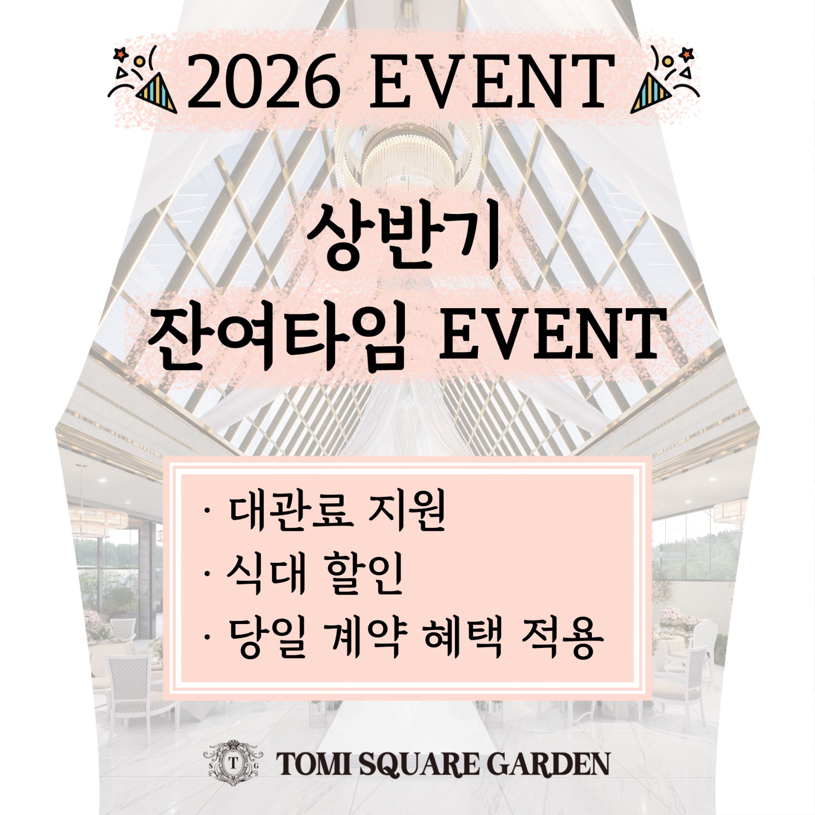 4개월 남짓, 얼마 남지 않은 기간 동안 짧은 시간 내에 예식을 준비하고자 하는 신랑, 신부님들을 위해2026년 상반기 잔여타임 이벤트를 진행하고 있습니다.혜택 1 - 대관료 100% 지원혜택 2 - 식대 중복 할인혜택 3 - 당일 계약 혜택 추가 할인기간이 얼마 남지 않은 만큼 많은 문의 부탁드립니다♡